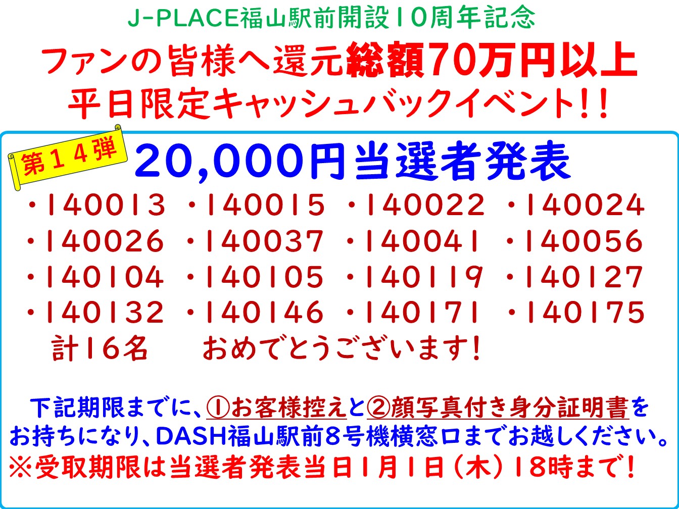 キャッシュバックイベント第14弾 当選者発表