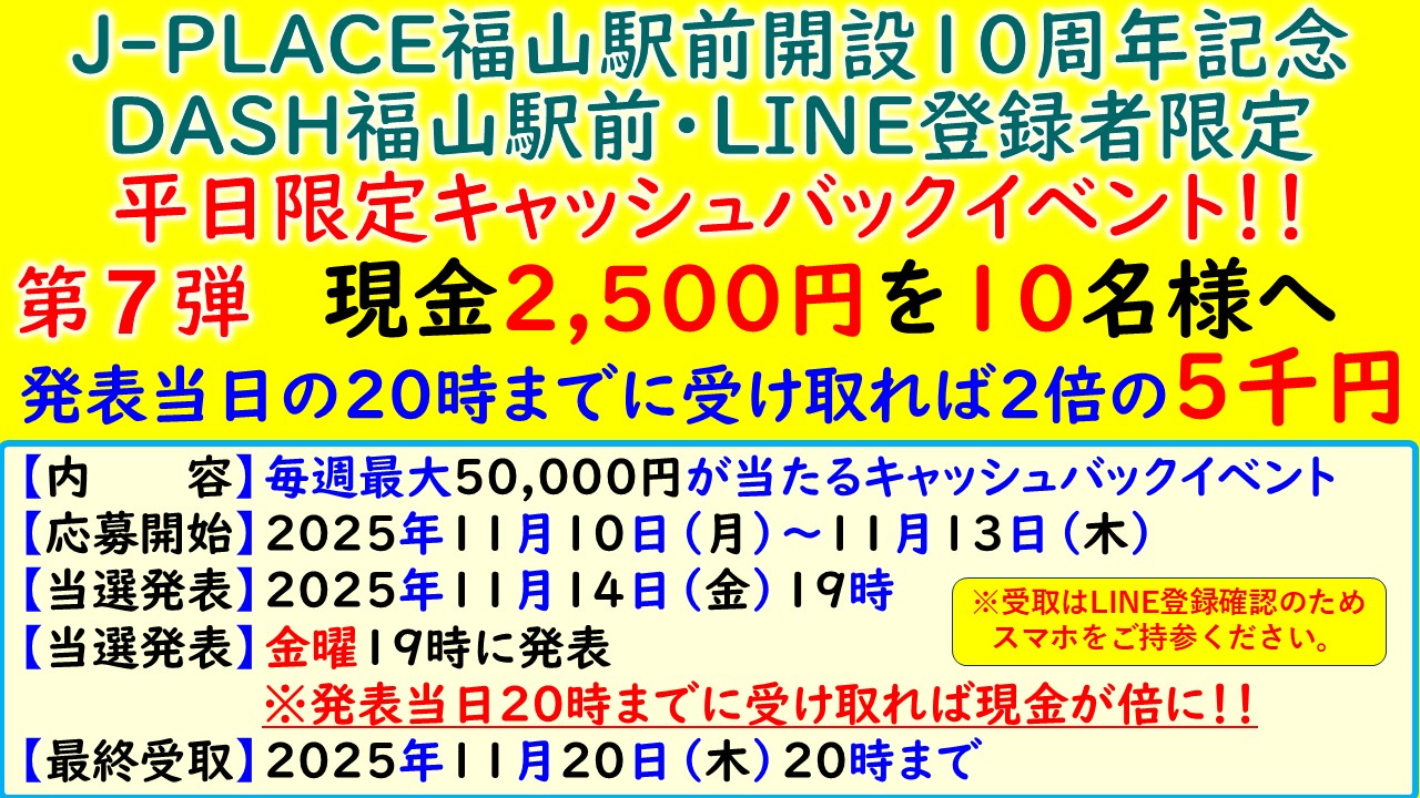キャッシュバックイベント第7弾について ●第7弾(11月10日~11月14日応募期間)は、LINE登録者限定のイベントとなります。 ●LINE未登録のお客様は、ご応募前にLINEお友達登録をお願いいたします。 ●当選金のお受け取りには、LINE登録の確認のためスマートフォンが必要です。ご了承ください。